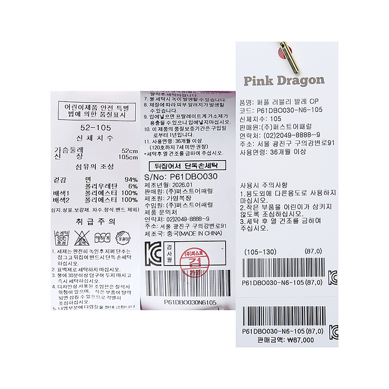 겉감 : 면 94 폴리우레탄 6 배색 1 폴리에스터 100 배색 2 폴리에스터 100 -