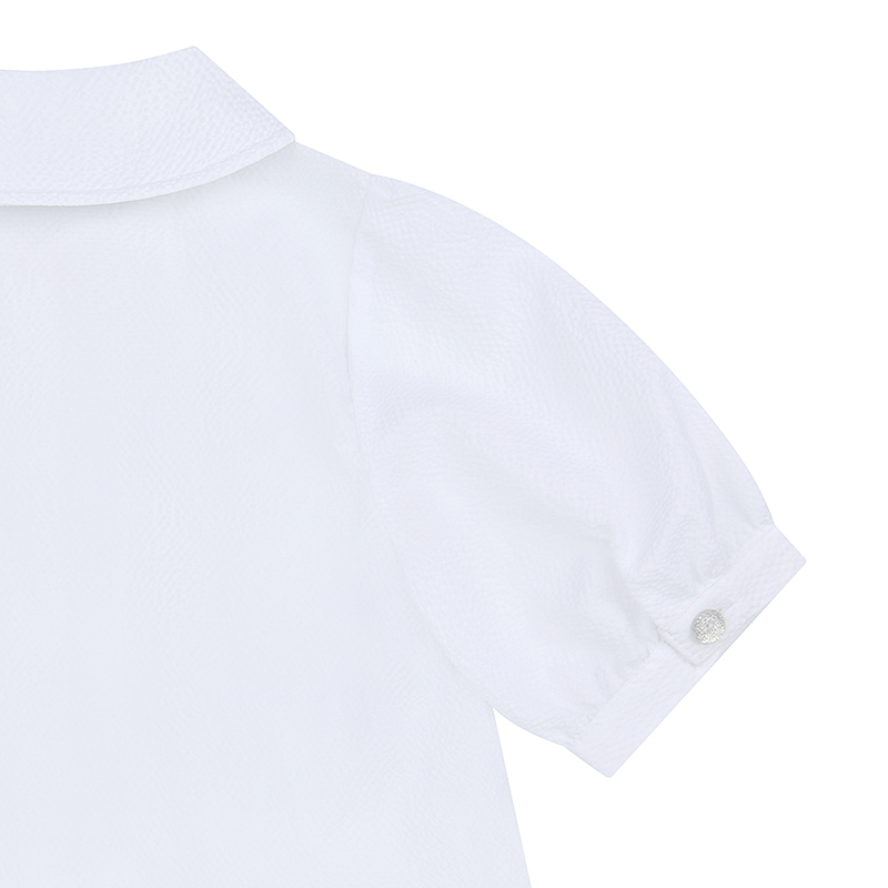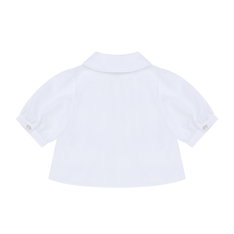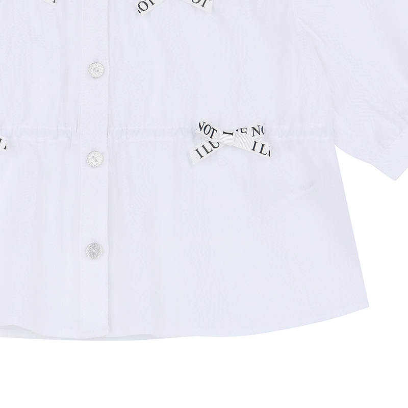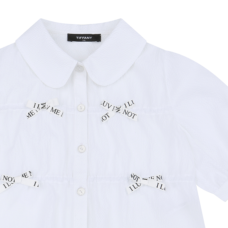깔끔한 느낌을 주는 화이트 카라 블라우스 몸판에 이밴드 셔링디테일로 귀여운 느낌을 주며 리본장식이 고정되어 포인트를 주는 아이템 입니다.