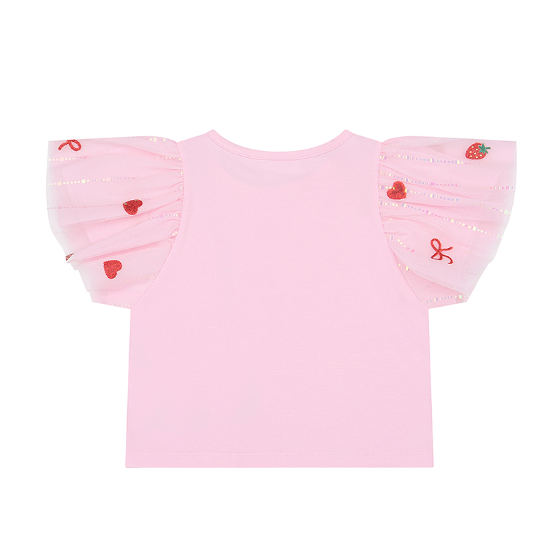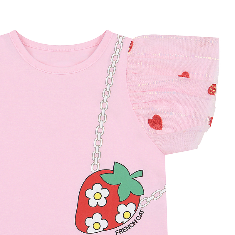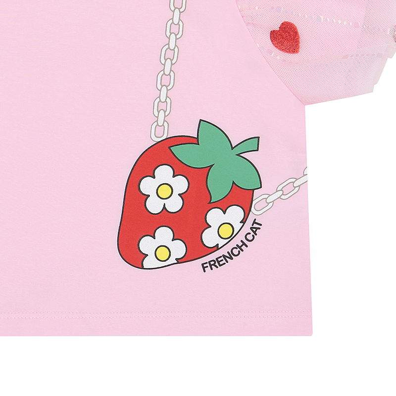 -핑크 티셔츠에 커다란 딸기 크로스백 그래픽이 들어가 있어 별도의 액세서리 없이도 충분히 화려한 아이템