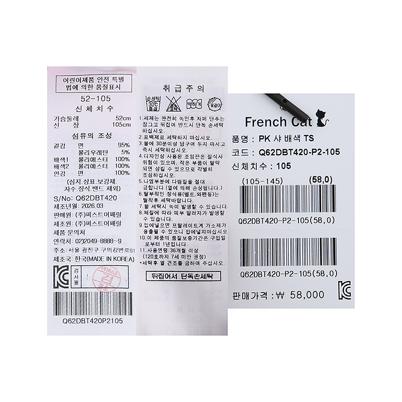 겉감 면95 폴리우레탄5배색1 폴리에스터100배색2 폴리에스터100안감 면100 -