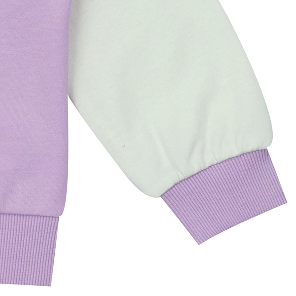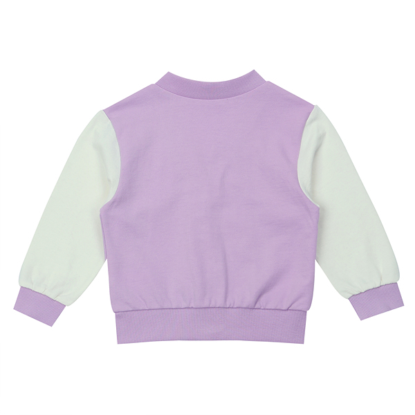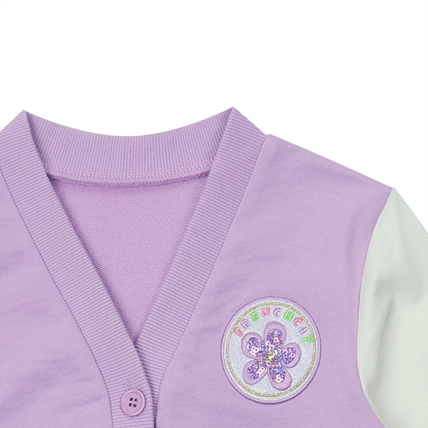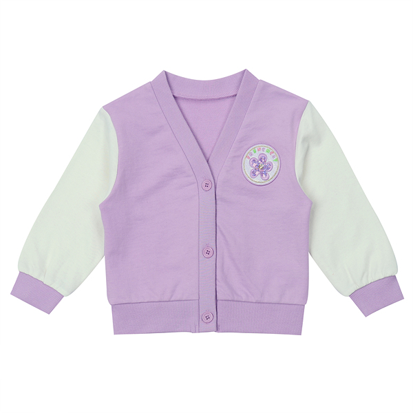 다이마루로 된 이지 캐주얼 야구 점퍼 스타일의 점퍼입니다. 보라색에 화이트 소매가 배색되어 경쾌한 느낌을 줍니다. 블링블링 꽃 모양의 와펜이 포인트가 되는 제품입니다.