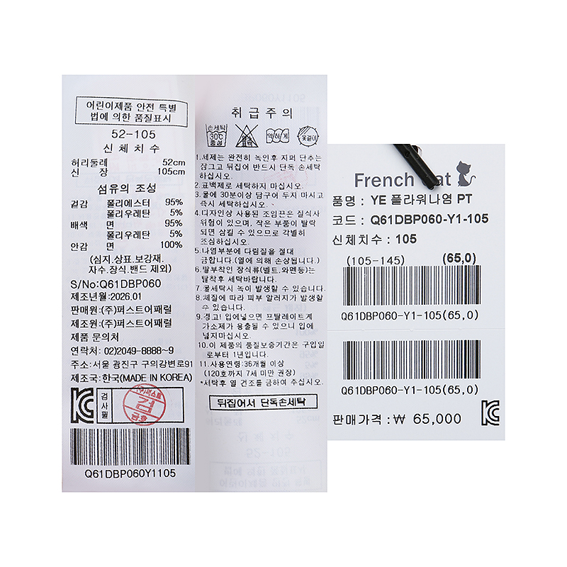 겉감 폴리에스터95 폴리우레탄5배색 면95 폴리우레탄5안감 면100 -