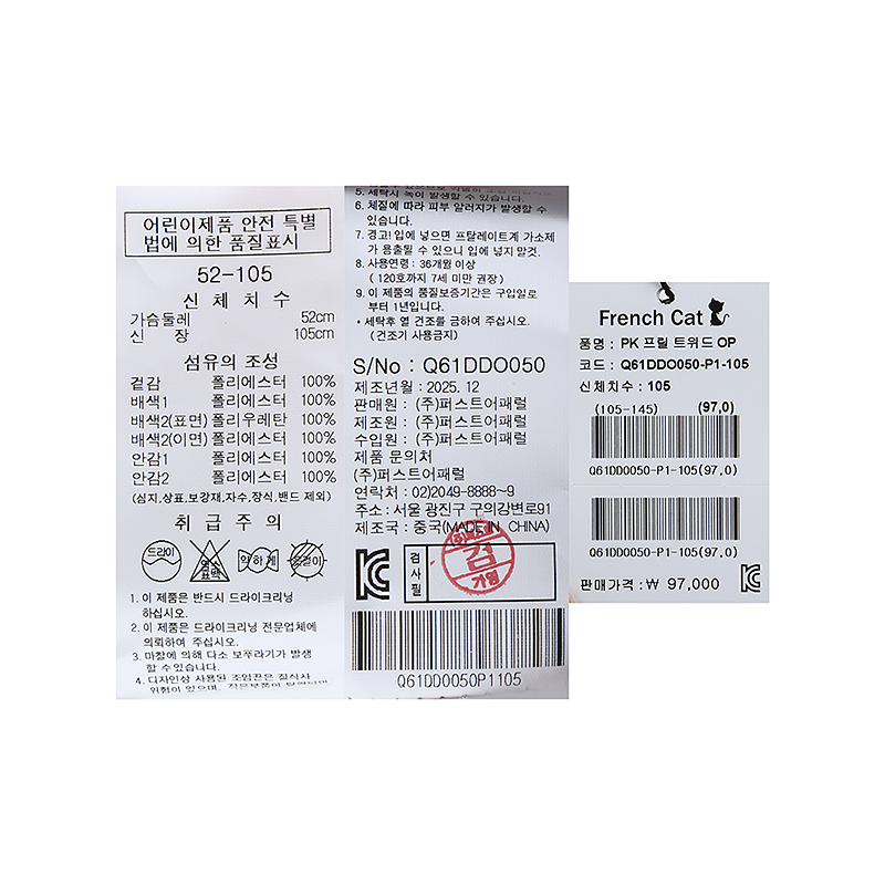 겉감 폴리에스터100배색1 폴리에스터100배색2 표면 폴리우레탄 100/이면 폴리에스터 100안감1 폴리에스터100안감2 폴리에스터100 -