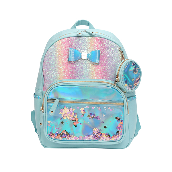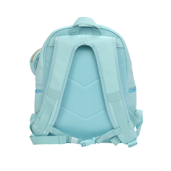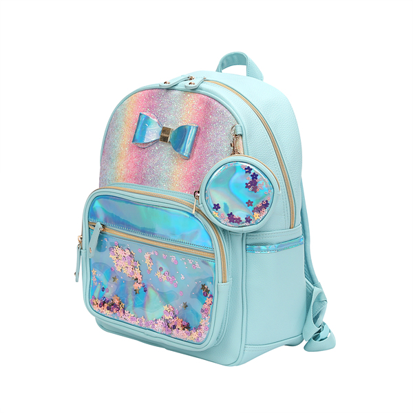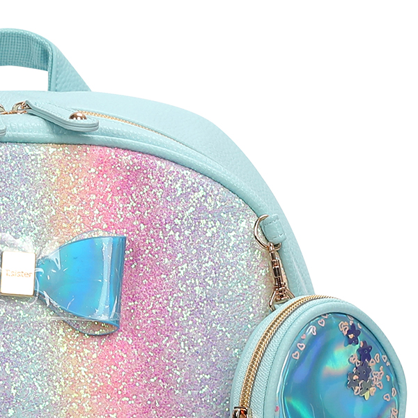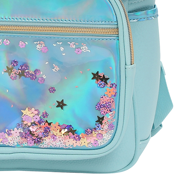 무지개 오로라 펄 소재를 바디로 사용하고 앞포켓에 홀로그램 소재를 사용하여 화려함을 살려준 책가방입니다. 특히 앞포켓에는 반짝이는 스팽글 장식을 넣어 장식 효과를 주었습니다. 탈부착 동전지에도 스팽글을 넣어 포인트를 주고 가방끈에 끈 벗겨짐 방지 고리를 추가하여 착용감이 더욱 좋도록 하였습니다.
