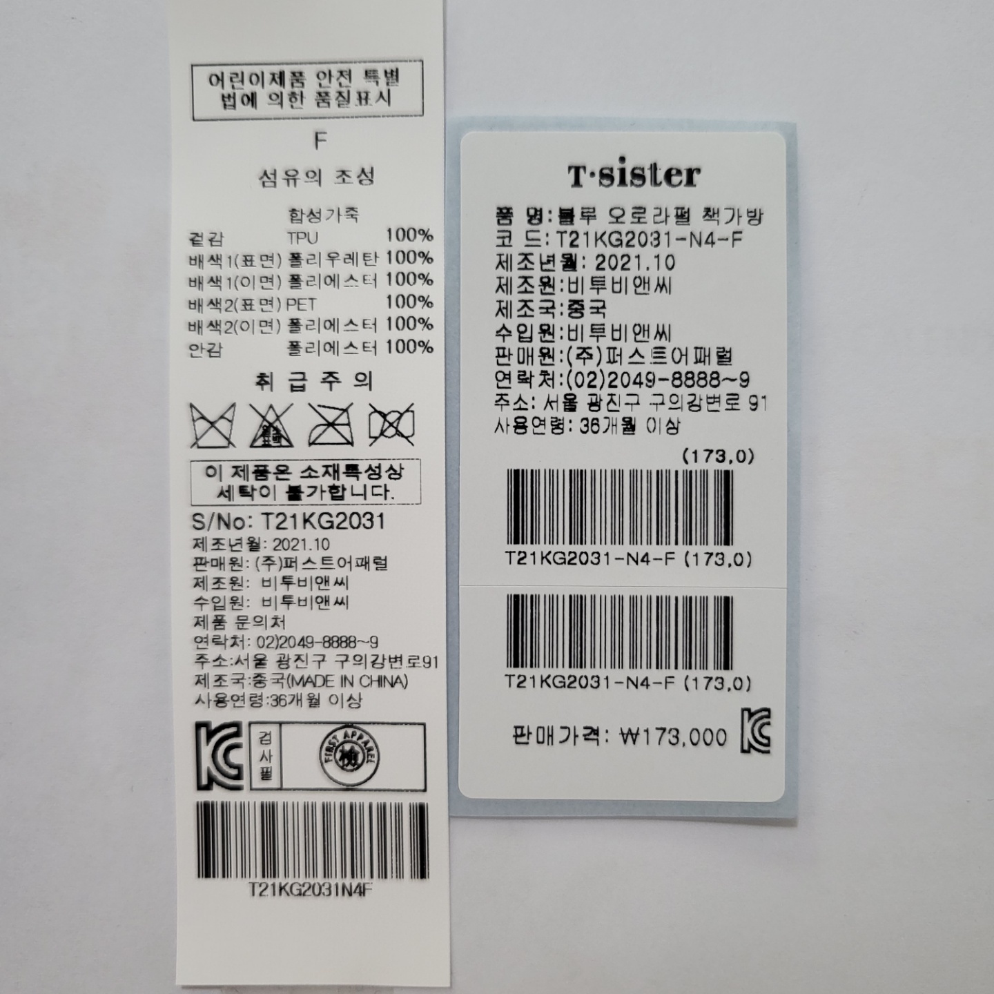 (합성가죽)겉감: TPU 100배색 1 표면 폴리우레탄 100 이면 폴리에스터 100배색 2 표면 PET 100 이면 폴리에스터 100안감: 폴리에스터 100 -