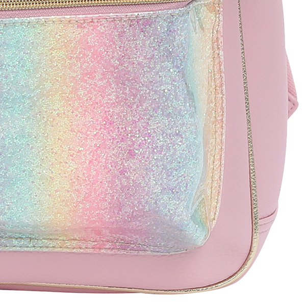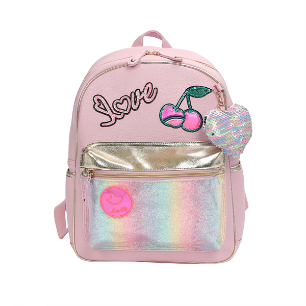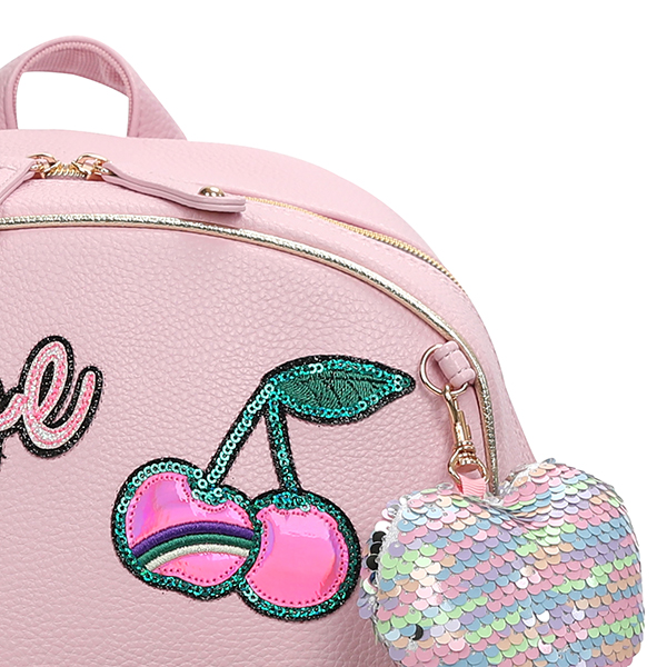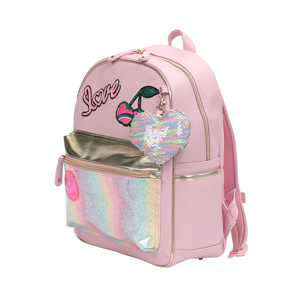 핑크 컬러 바디에 앞포켓에 무지개 오로라 펄 소재와 골드 소재로 포인트를 준 책가방입니다. 전체적으로 로고앵두 스마일 와펜 장식으로 포인트를 주고 리버스 스팽글 하트 장식으로 포인트를 준 가방입니다. 가방끈에 끈 벗겨짐 방지 고리를 추가하여 착용감이 더욱 좋도록 하였습니다.