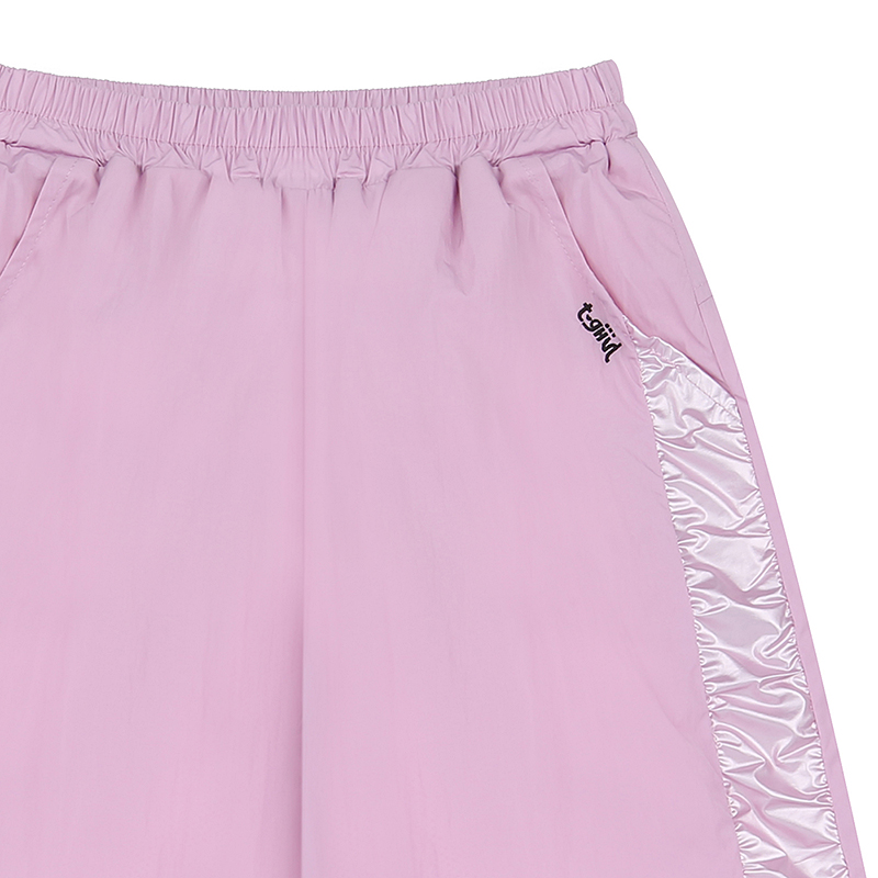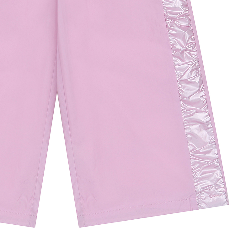 화섬 팬츠로 옆선에 광택 소재에 셔링을 잡아 포인트를 준 팬츠입니다. 안감은 폴리메쉬 소재를 사용하였고 밑단 스트링 장식으로 조여줄 수 있는 스타일입니다.