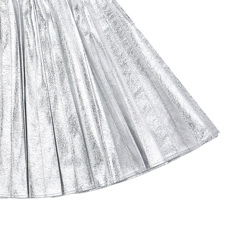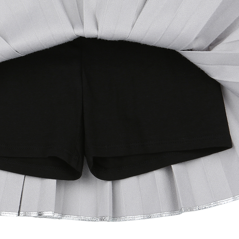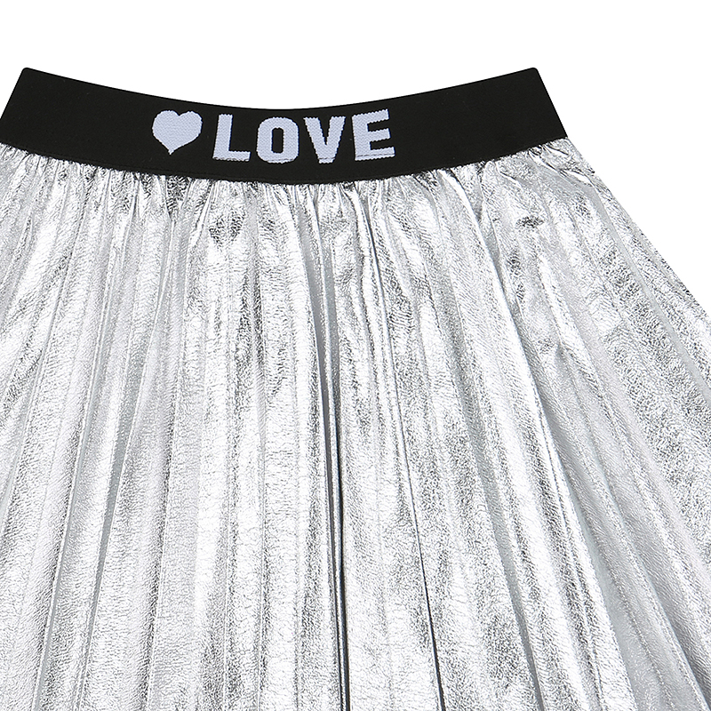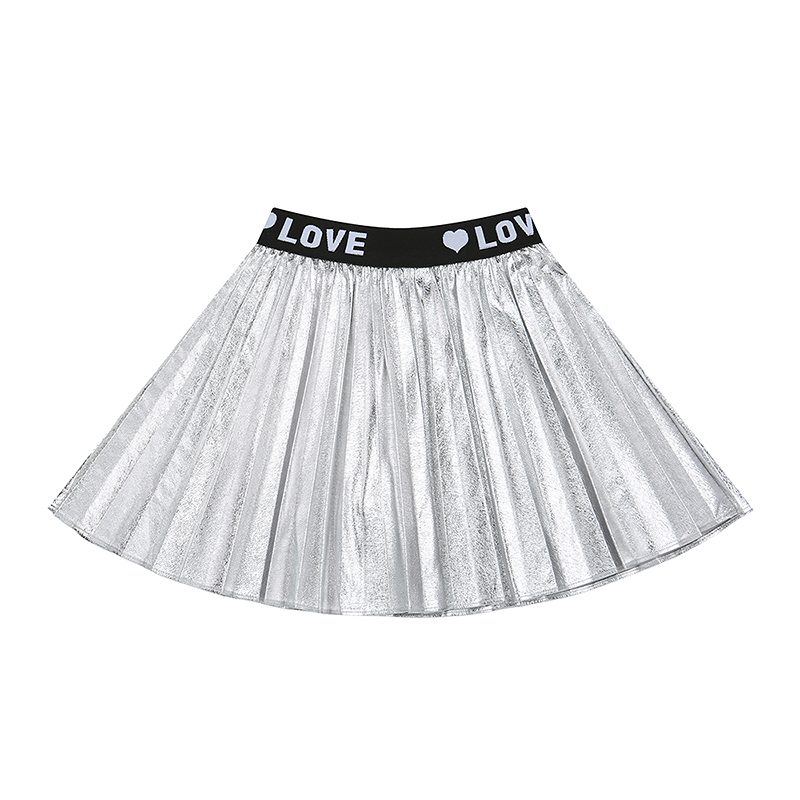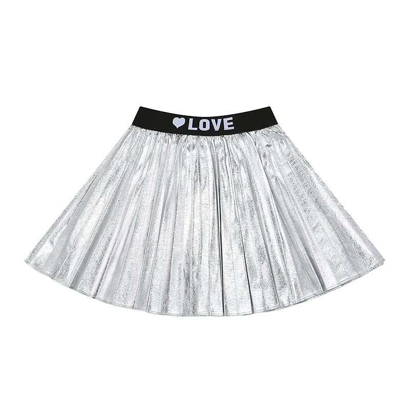 트렌디하고 유니크한 실버 소재를 사용한 플리츠 SK 입니다. 허리 로고 밴드 장식과 안에 스판 속바지를 넣어 착용이 편한 스타일입니다.