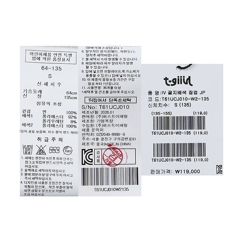 겉감 : 면 100 배색 1 폴리에스터 92 폴리우레탄 8 배색 2 폴리에스터 100 -