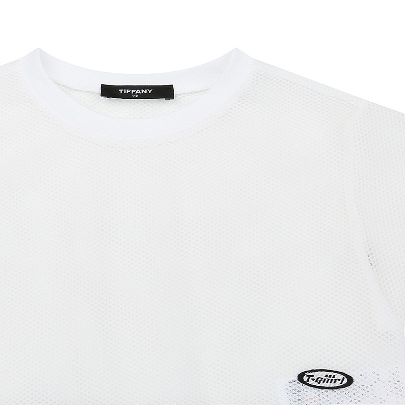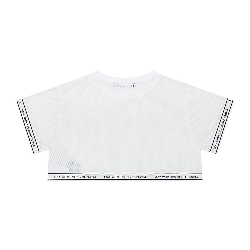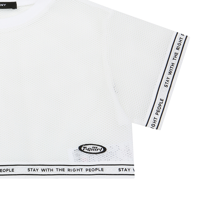 메쉬소재의 크롭티셔츠로 소매와밑단에 유니크한 테이프배색을 덧데어 한층 더 멋스러운 느낌을 더해주는 티셔츠로 이너티와 같이 코디하시면 좋은아이템.