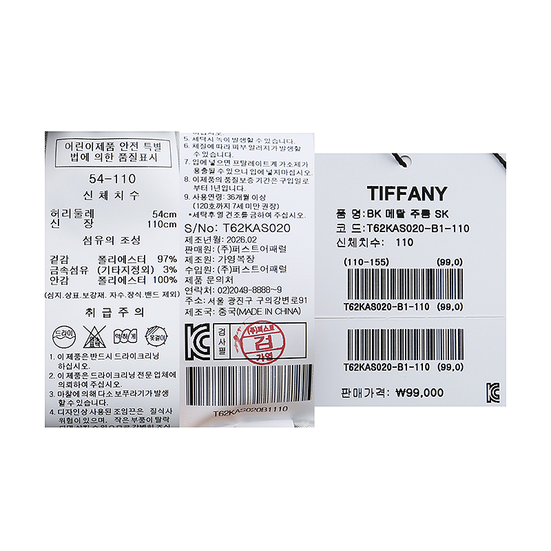 겉감 : 폴리에스터 97 금속섬유(기타지정외) 3 안감 폴리에스터 100 -