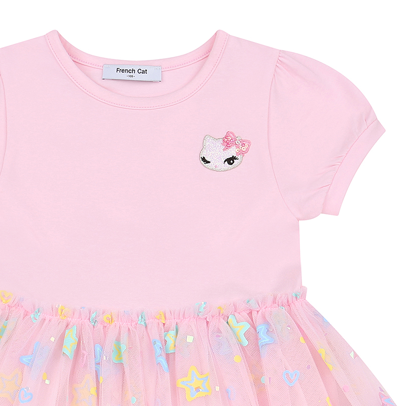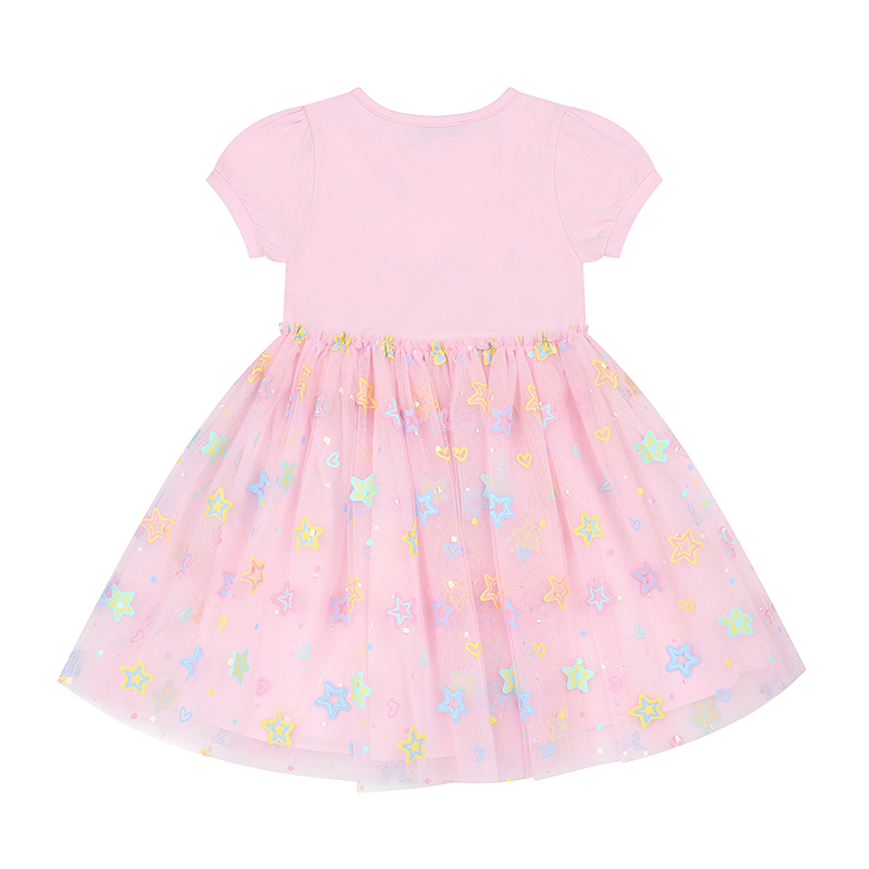 아이들이 좋아하는 러블리한 원피스 디자인이며 스커트 샤에 들어간 별들이 포인트로 봄여름에 화사하게 코디하기 좋은 아이템입니다.
