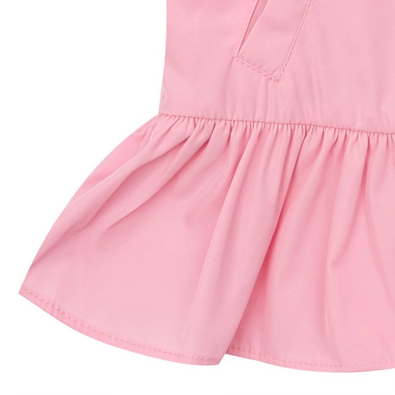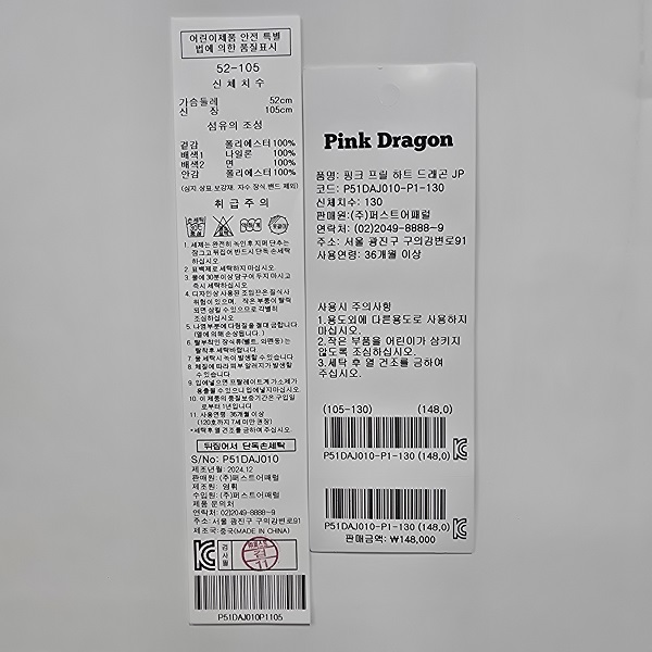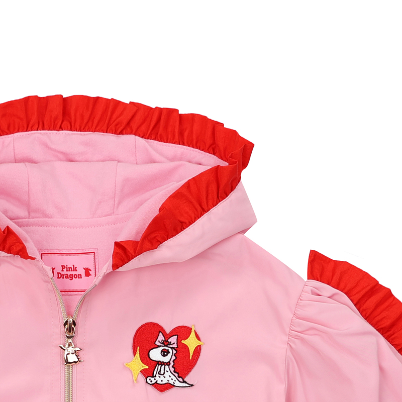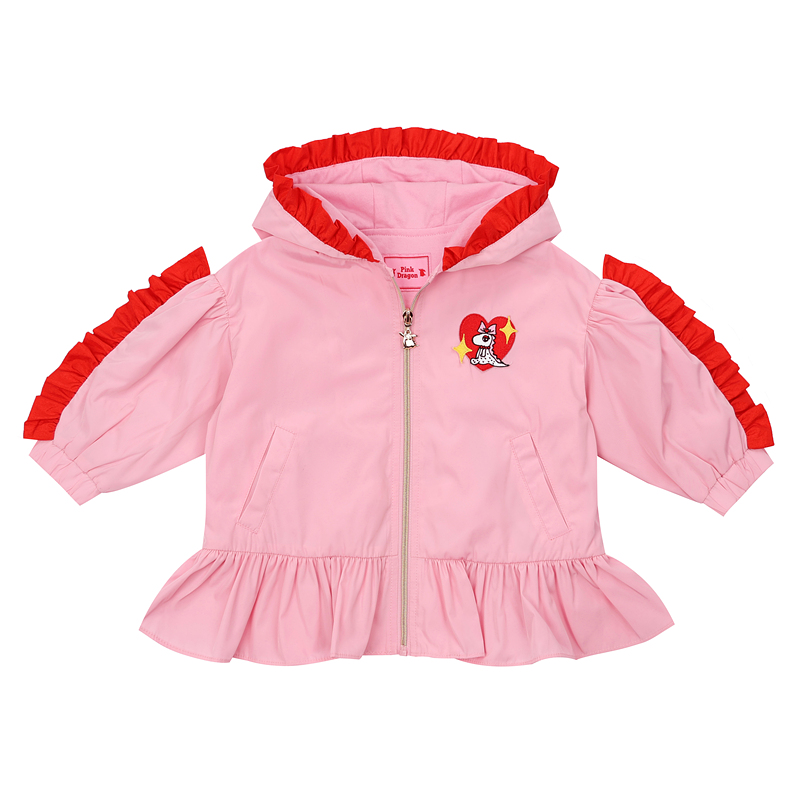 -얇고 터치감이 부드럽고 가벼운 화섬원단에 은은한 광택감이 도는 프릴장식과 몸판과 후드에는 부드러운 미니쮸리 원단 소매와 포켓은 듀스포 원단을 사용한 핑크 프릴 하트 드래곤 JP 에요.