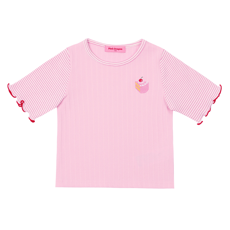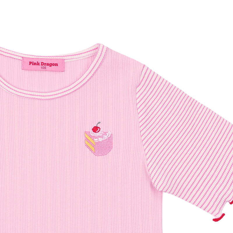 작은 쇼트케이크 자수가 우측에 귀여운 포인트로 들어갔어요. 몸판도 소매통도 슬림한 실루엣이에요.