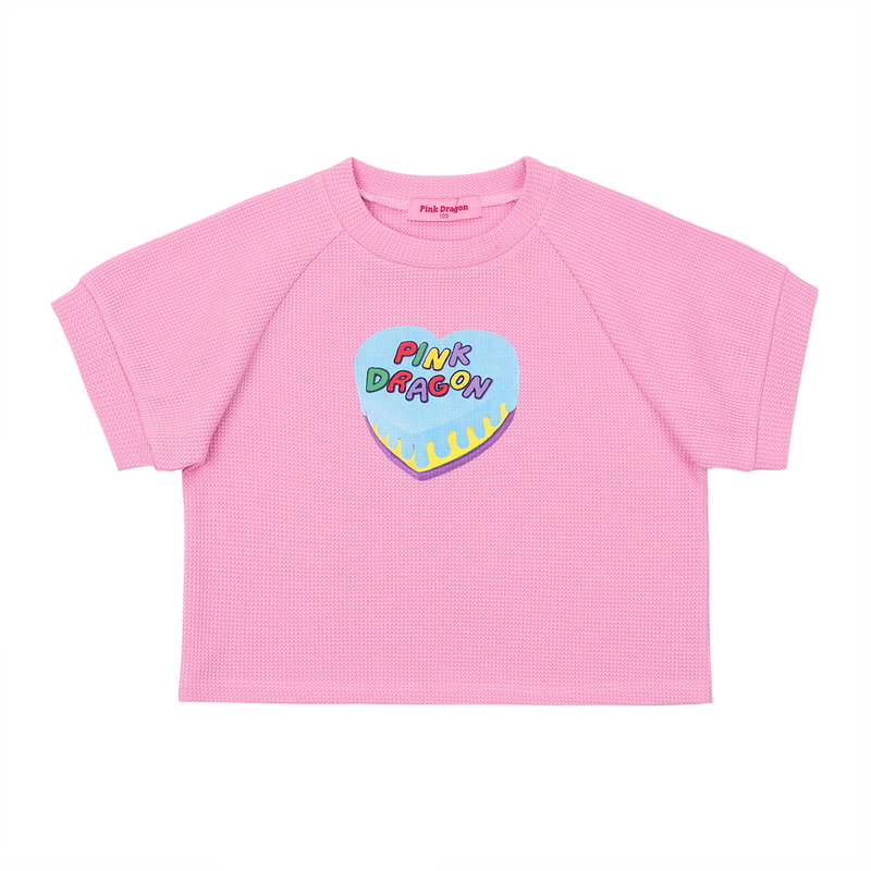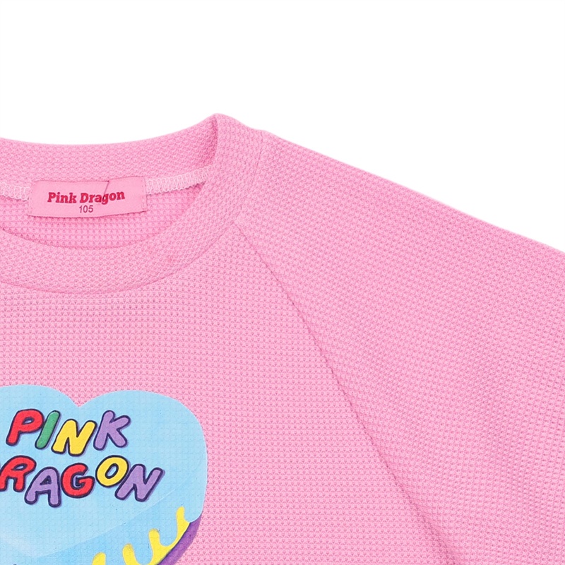 -박시핏 나그랑소매로 앞판 핑크 드래곤 하트 케익 살사 나염이 사랑스러워요.