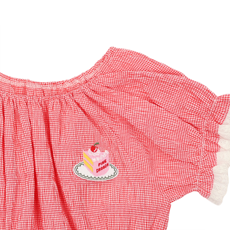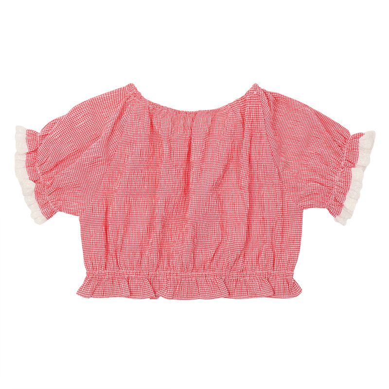 -부드러운 체크패턴 요루지 원단에 소매 레이스 배색을 더한 레드 체크 오프숄더 BL 에요.