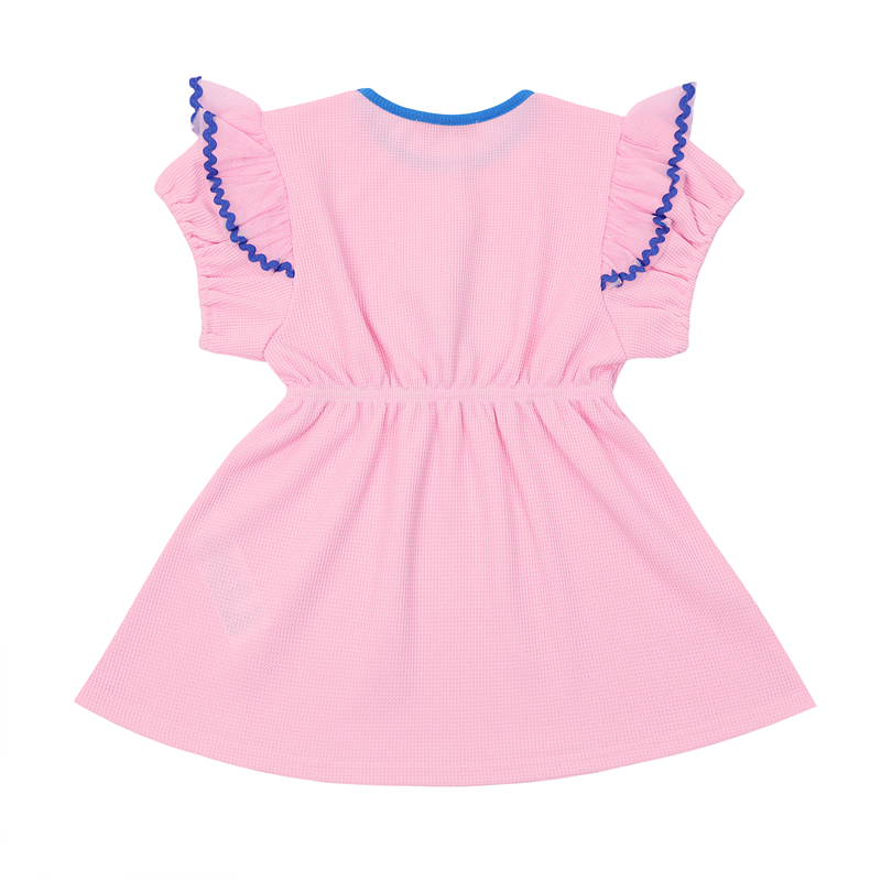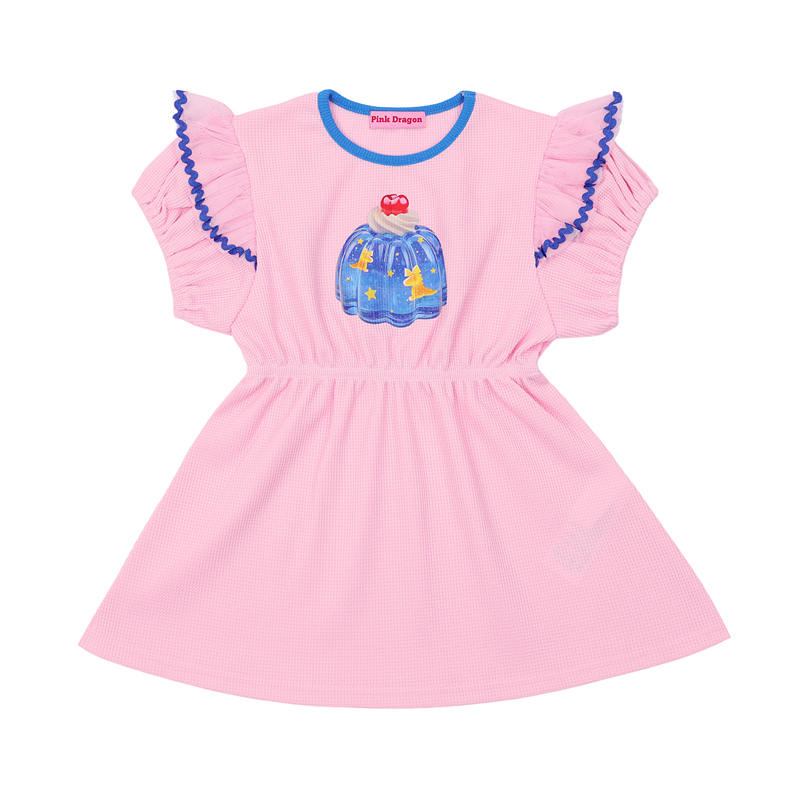 어깨에 샤프릴이 풍성하게 장식되어있어요. 목랍바 어깨프릴의 자바라 테이프 그래픽에 블루 포인트를 줘서 청량함을 더해주었어요.