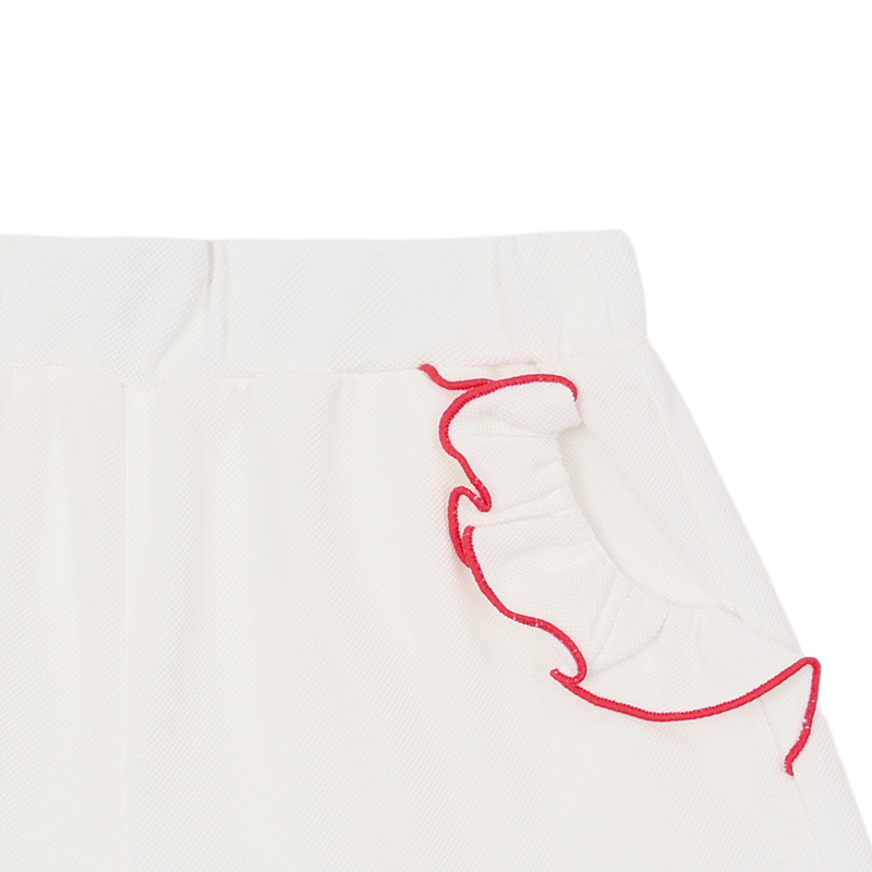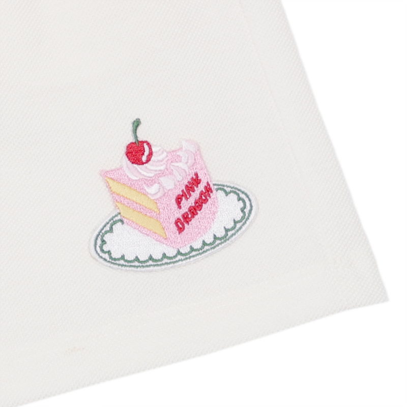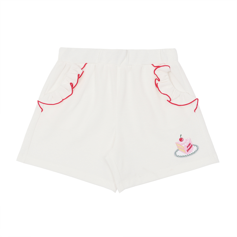 쇼트케이크 자수와 주머니 입구의 끝 레드 인터록 프릴이 사랑스러움을 UP!