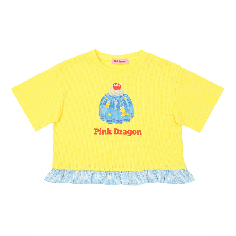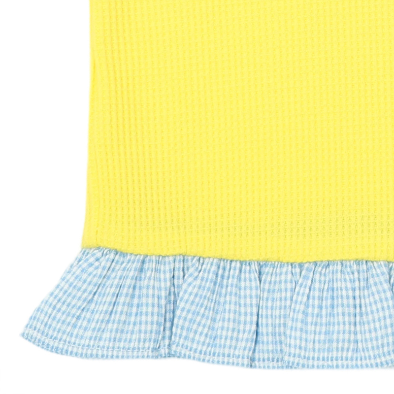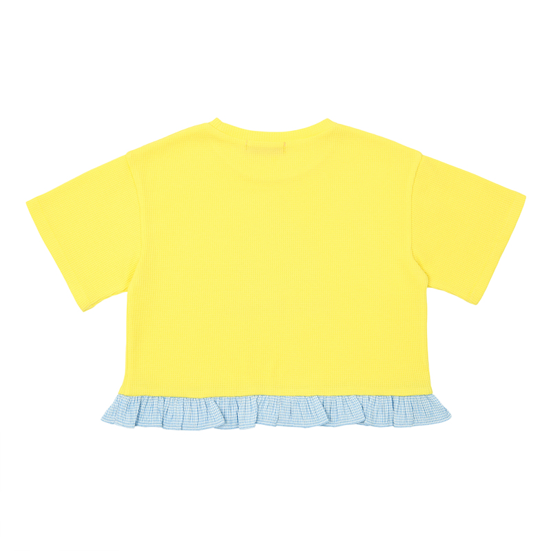 -부드럽고 텐션이 있는 와플원단에 밑단에 체크요루지 원단 배색을 더한 YL 배색 디저트 TOP 이에요.