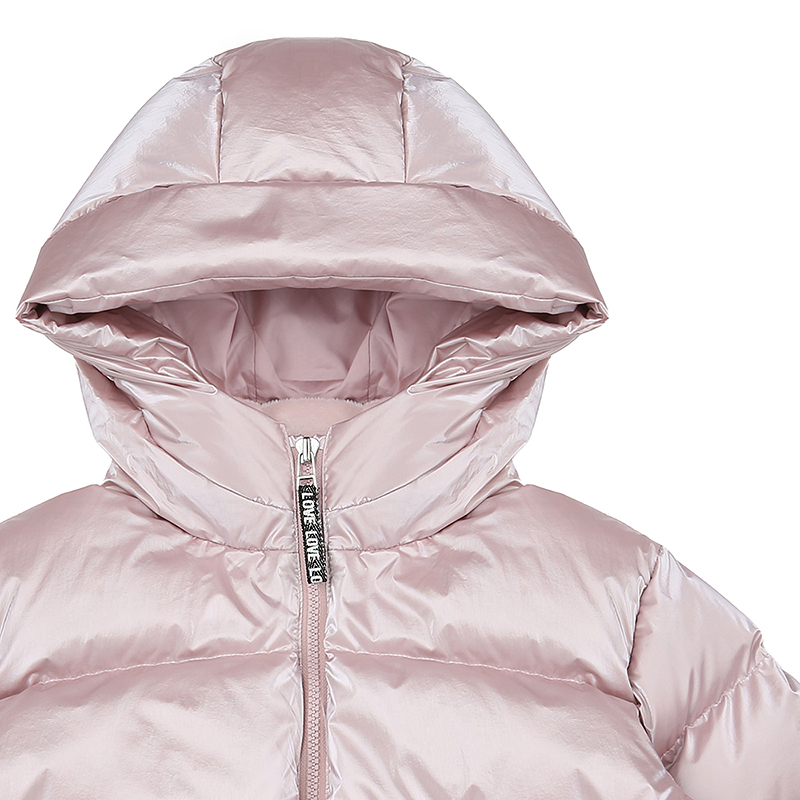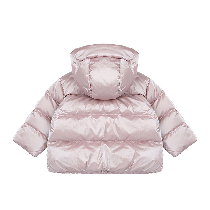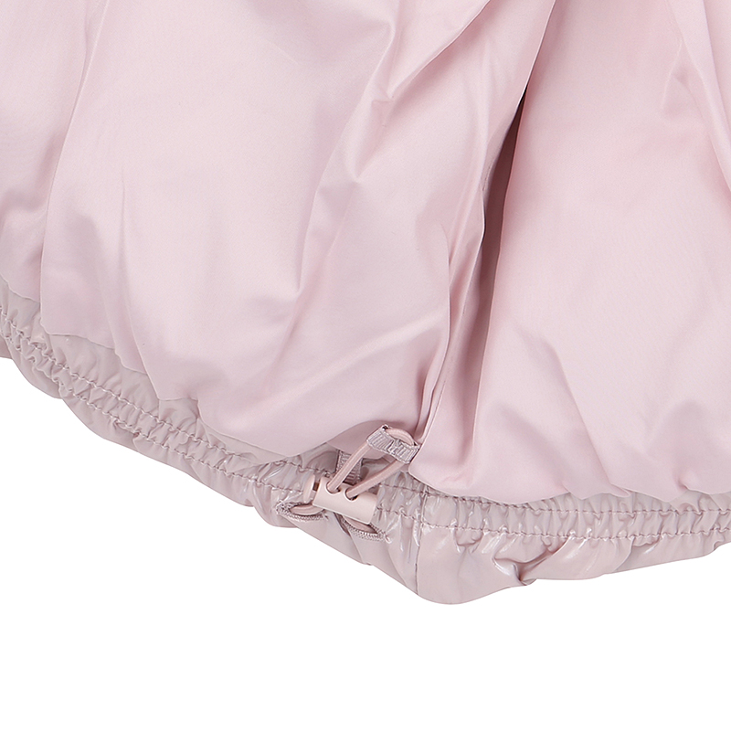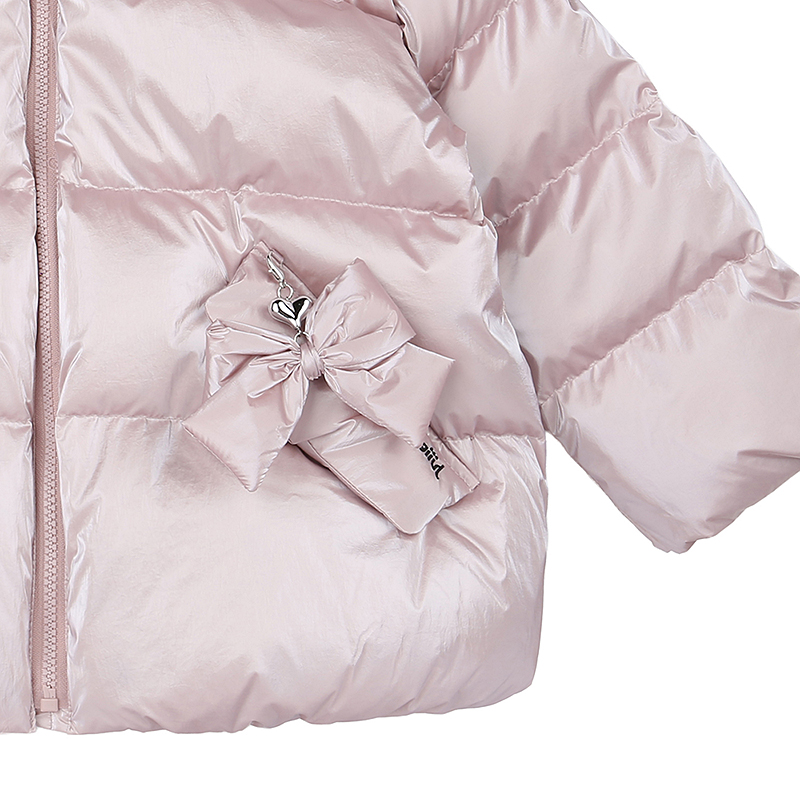 은은한 펄감이 있는 샤이닝한 소재를 사용한 오리털 점퍼입니다. 중힙 기장 후드 스타일로 사선 퀼팅으로 변화를 준 점퍼입니다. 포켓에 패딩 리본 장식으로 귀여운 포인트를 주었습니다.