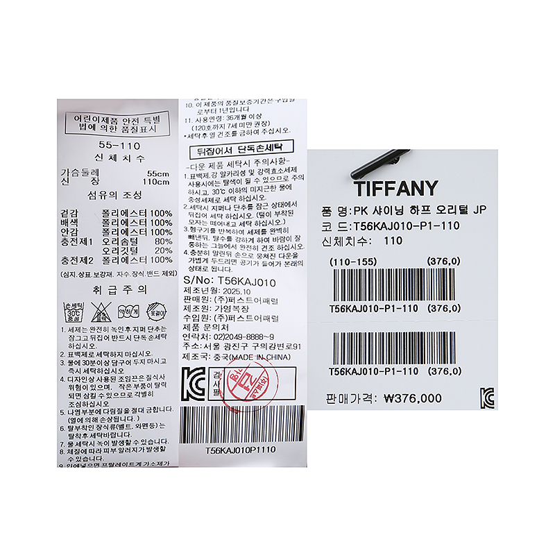 겉감 : 폴리에스터 100 배색 폴리에스터 100 안감 폴리에스터 100 충전제 1 오리솜털 80 오리깃털 20 충전제 2 폴리에스터 100