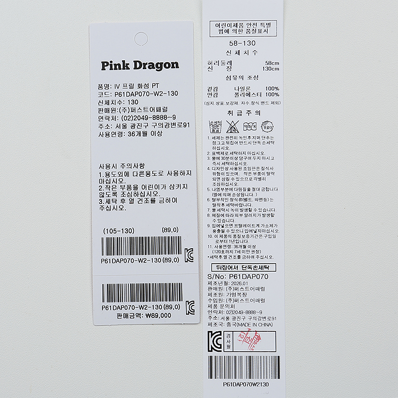 겉감 : 나일론 100 안감 폴리에스터 100 -