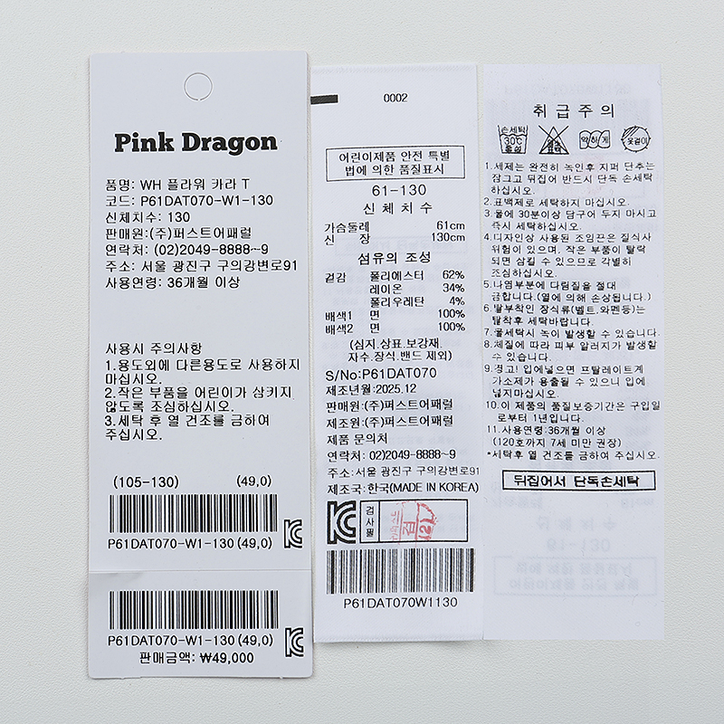 겉감 : 폴리에스터 62 레이온 34 폴리우레탄 4 배색 1 면 100 배색 2 면 100 -