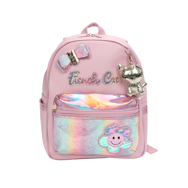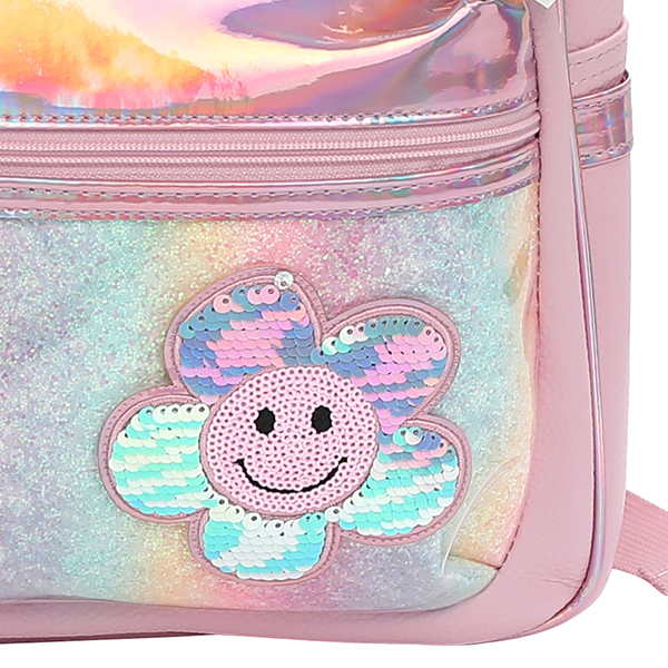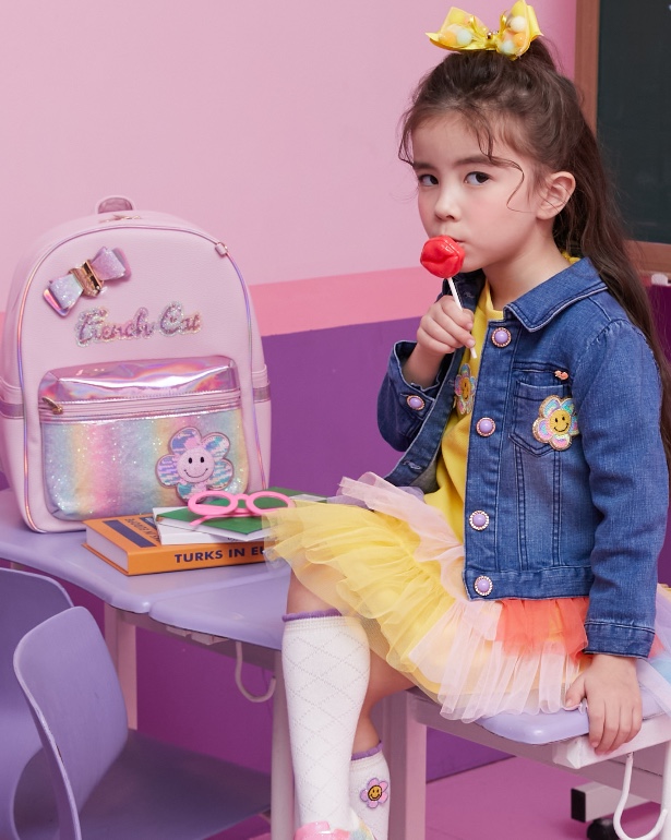 앞주머니를 블루 핑크 노랑 보라 칼라가 섞인 펄소재로 포인트를 주었습니다.