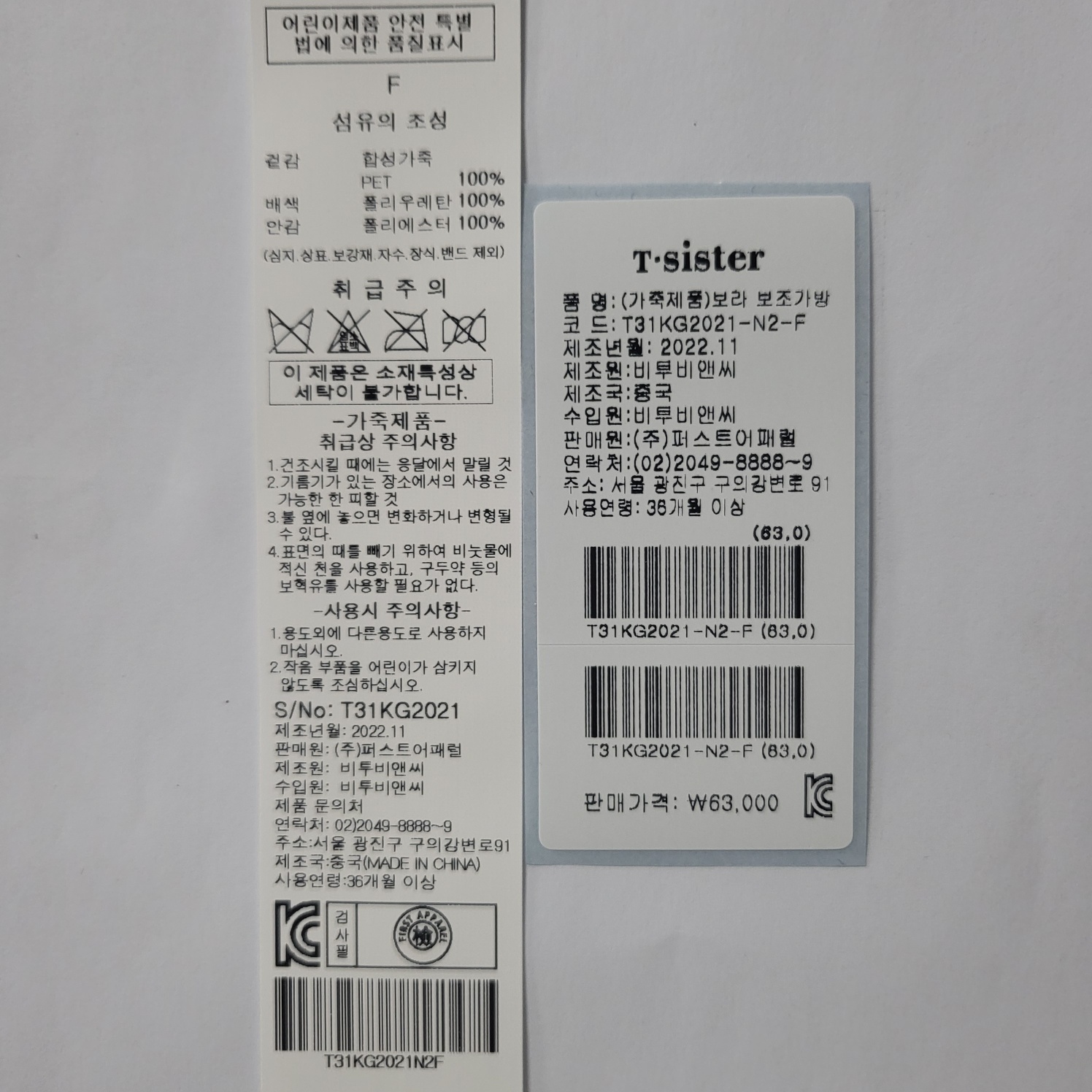 (합성가죽)겉감 PET 100 배색 폴리우레탄 100 안감 : 폴리에스터 100 -