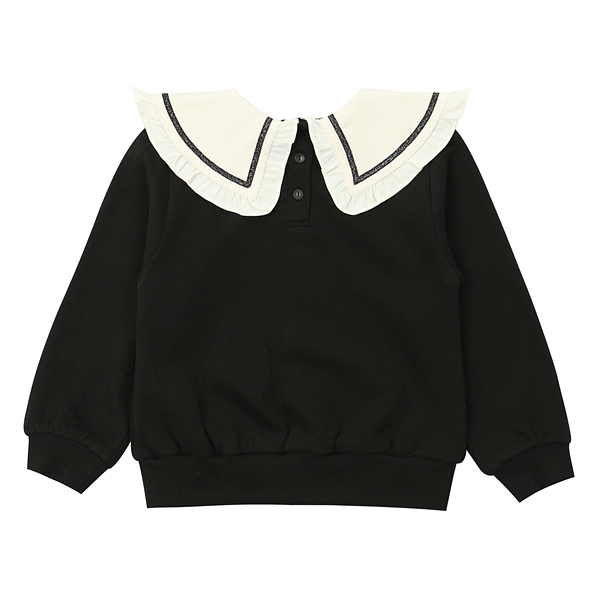 기모쭈리 맨투맨 스타일에 빅 프릴 카라가 달린 티셔츠입니다. 깔끔한 스타일로 모직 스커트와 코디하여 연출하기 좋은 스타일입니다.