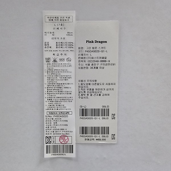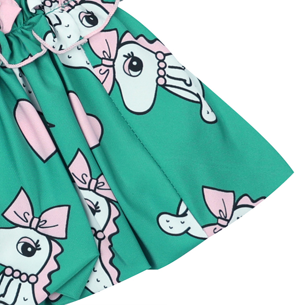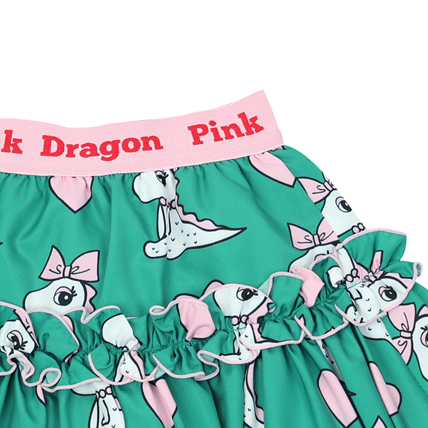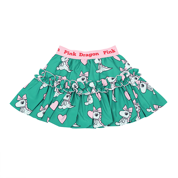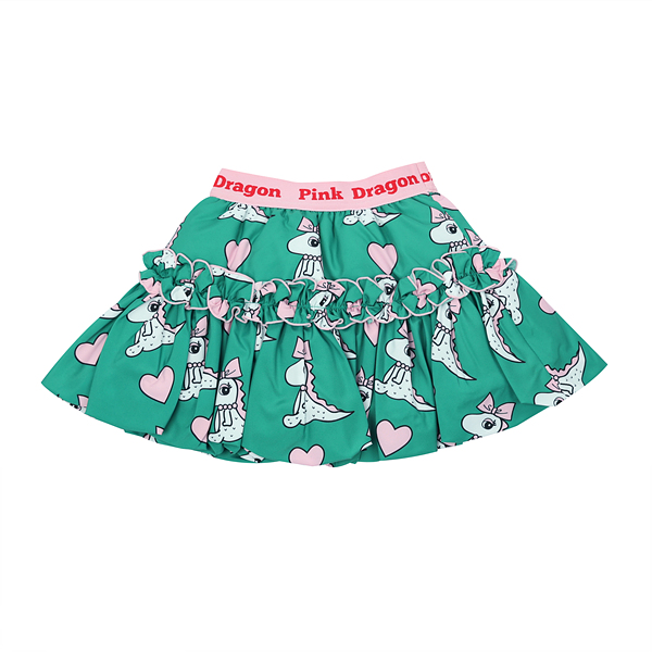 -소프트한 화섬소재에 귀여운 하트드래곤 전판원단과 안감은 퀼팅원단으로 보온성을 높인 그린 벌룬 스커트.