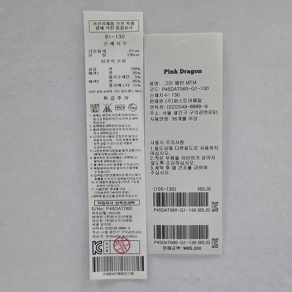 겉감 : 면 100 배색 1 면 95 폴리우레탄 5 배색 2 면 85 폴리에스터 15 -