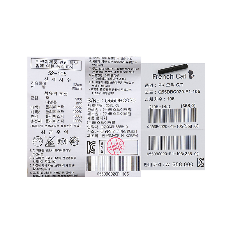 겉감 울90 나일론10배색1 폴리에스터100배색2 폴리에스터100안감 폴리에스터100충전재 폴리에스터100 -