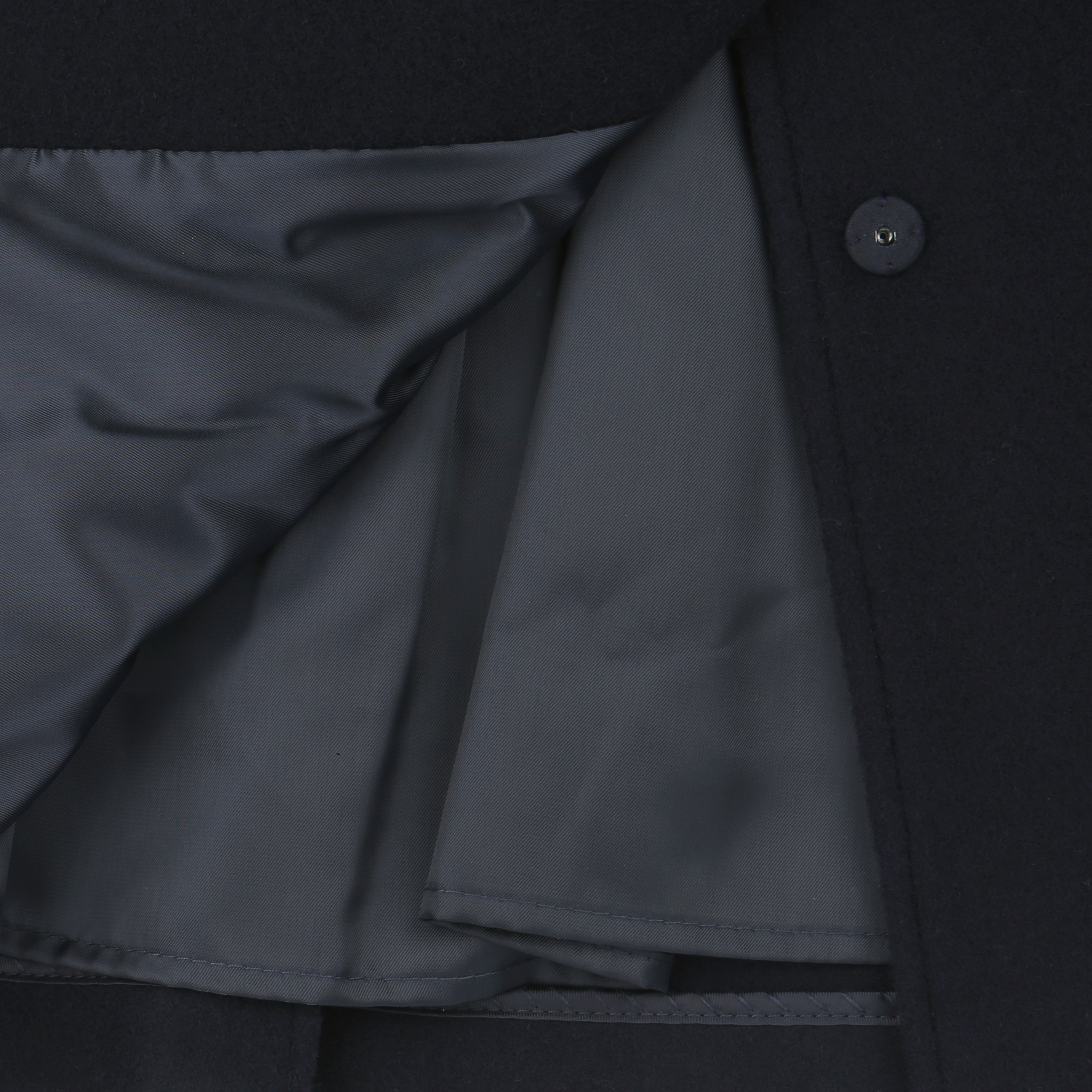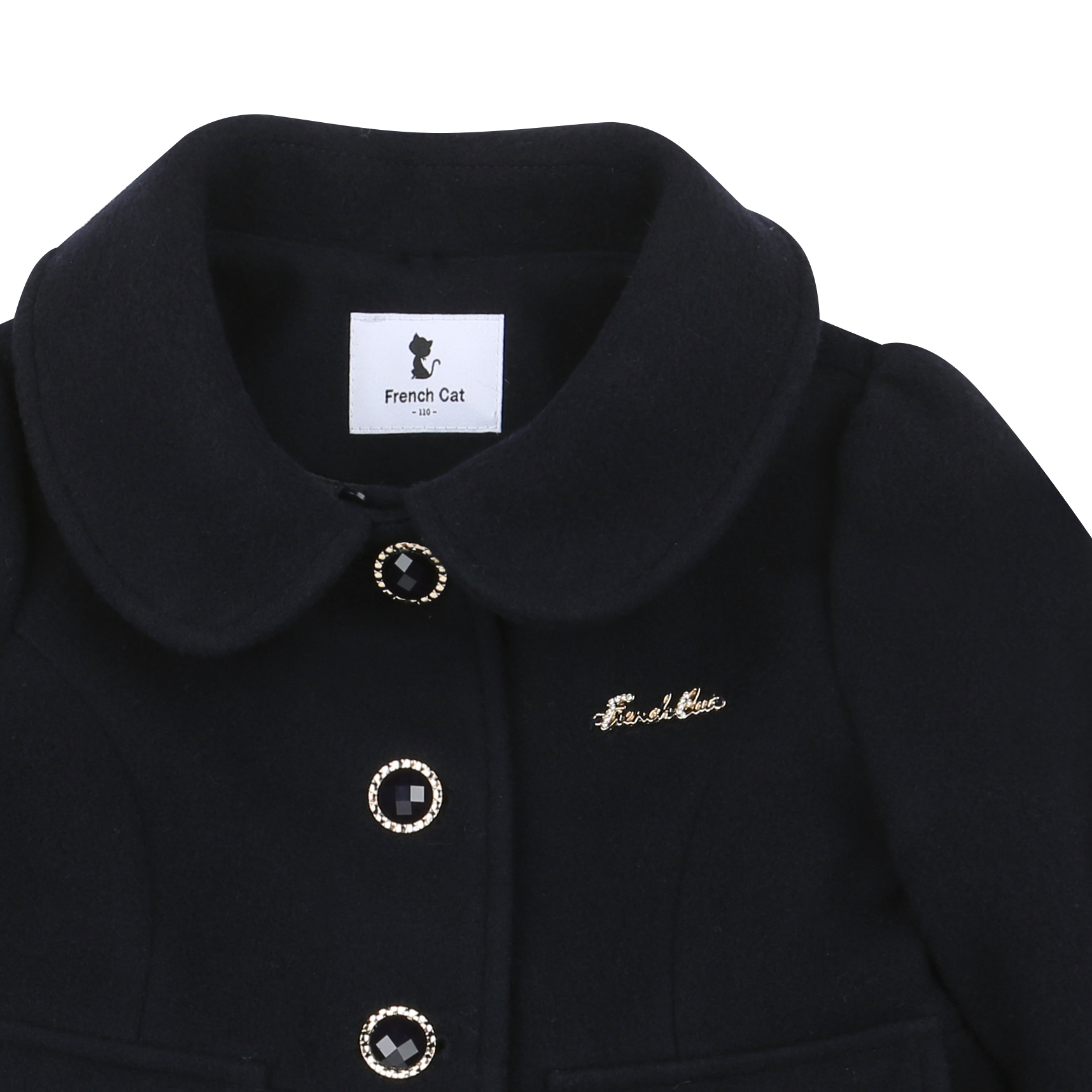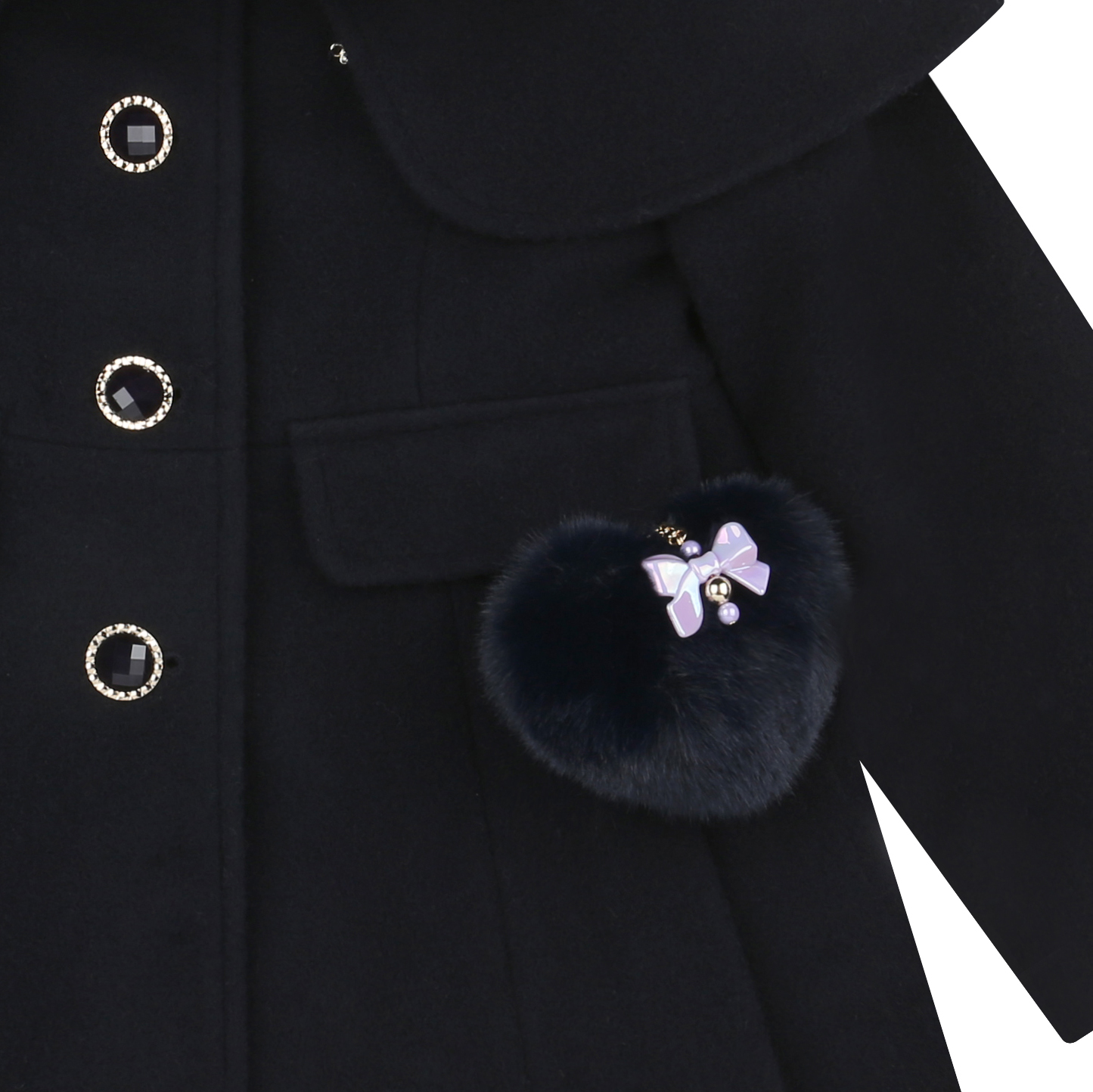 딥한 네이비 색상의 모직 코트입니다. 드레스 라인 코트로 케이프를 추가하여 고급스러움을 더했습니다. 탈착가능한 하트퍼 키링 장식이 포함된 제품으로 코디에 두루두루 활용해보세요.