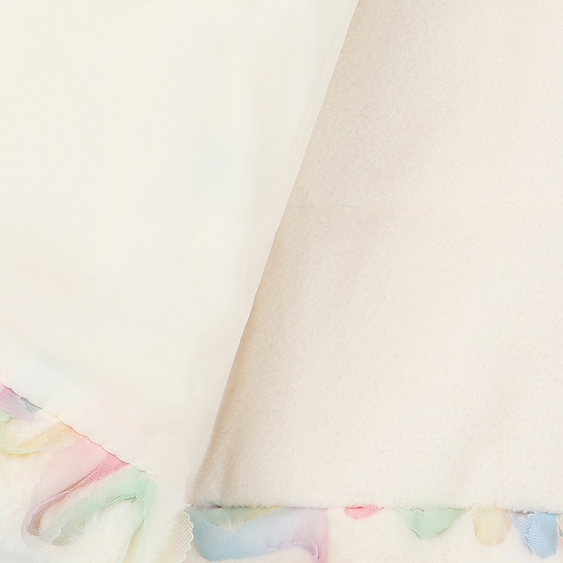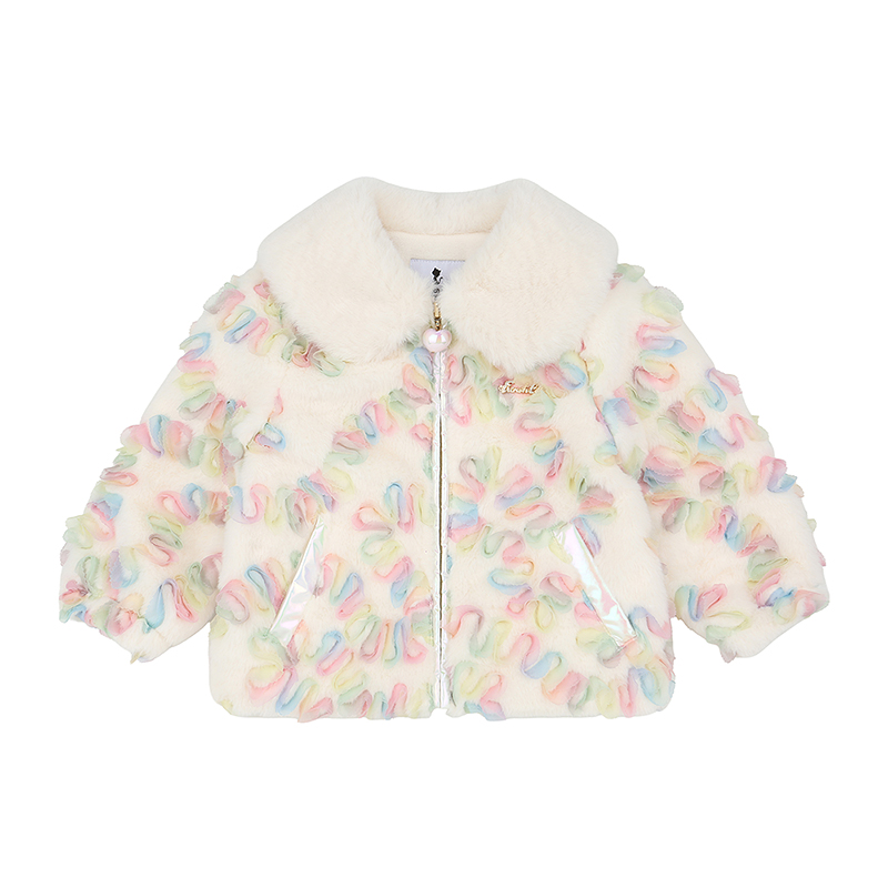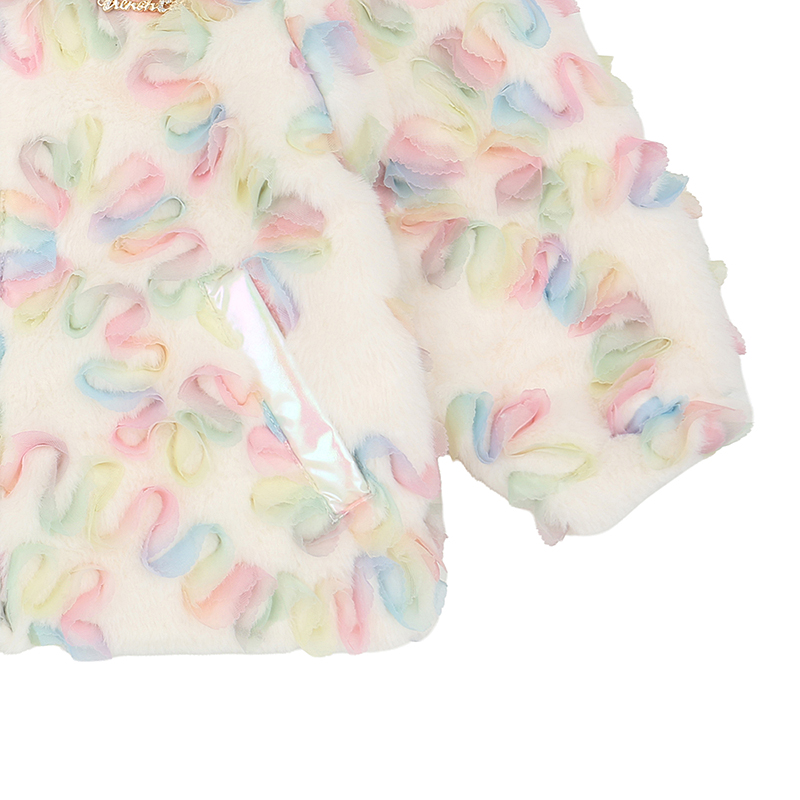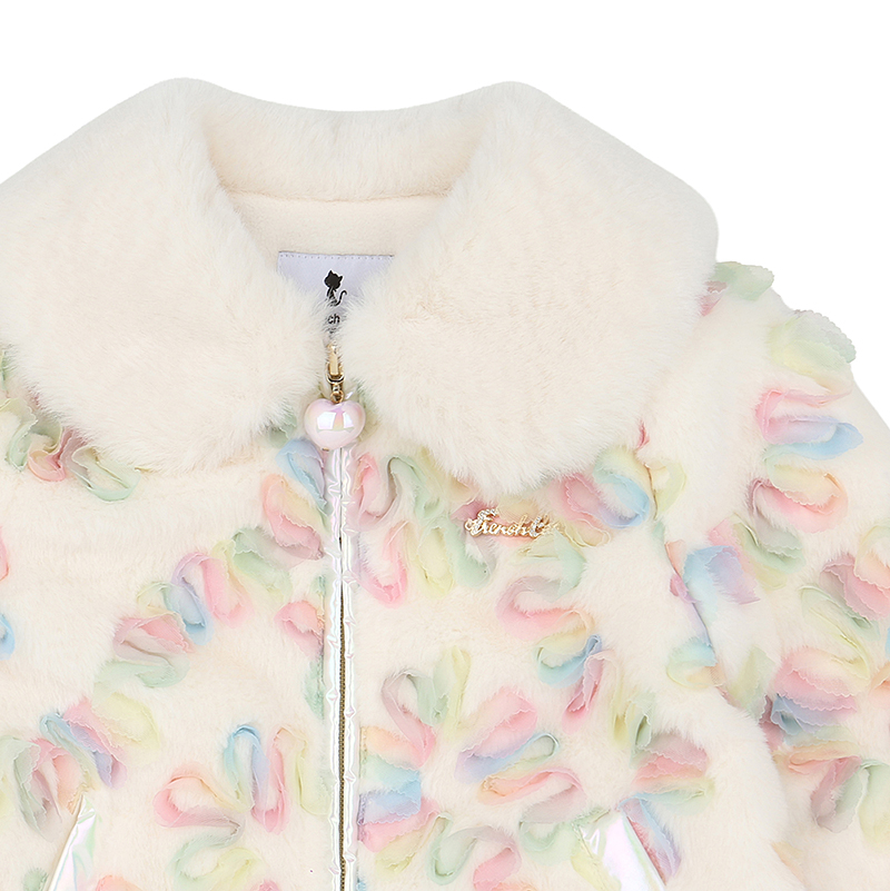 보드라운 퍼 원단에 무지개 샤프릴 자수가 놓여져 있는 유니크한 원단을 사용한 퍼 자켓입니다. 풍성한 퍼카라와 핑크 하트슬라이더 장식 디테일로 고급스러움을 더했습니다.
