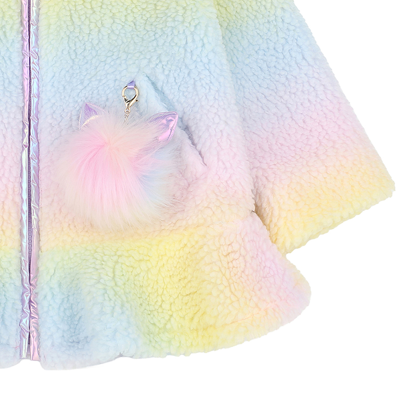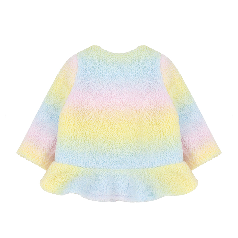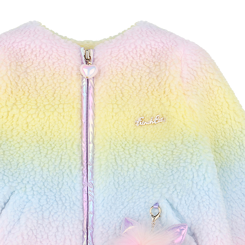 포근하고 사랑스러운 색감의 무지개 그라데이션의 뽀글이 원단을 사용한 점퍼입니다. 플레어 지는 밑단과 주머니 리본 장식이 사랑스러운 제품입니다. 하트 슬라이더 장식으로 디테일에 고급스러움을 더했습니다.