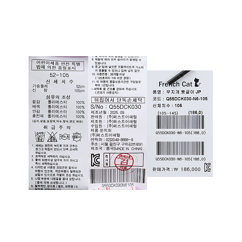 겉감 폴리에스터100배색 폴리에스터100안감 폴리에스터100충전재 폴리에스터100 -