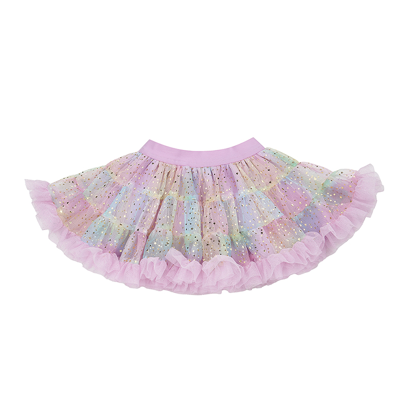 멀티 무지개 물나염에 골드빛 별무늬가 가득있는 블링블링한 샤로 제작된 스커트입니다. 각 티어드단마다 셔링을 풍성하게 잡아 볼륨있는 스타일의 스커트로 사랑스러운 연출에 도움을 줄 제품입니다. IV 푸들 배색 TS 와 함께 코디 연출해보세요.