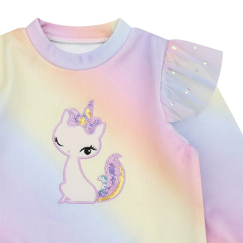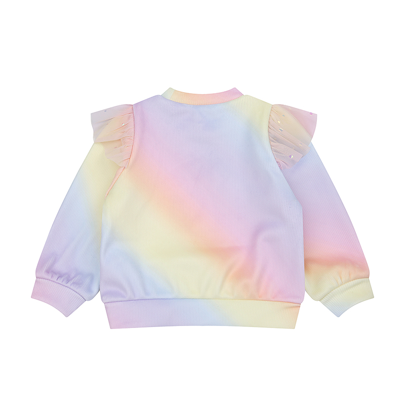 포근하고 보드러운 골지 기모 원단에 사선 무지개 그라데이션된 원단으로 만든 티셔츠입니다. 어깨에 무지개샤 프릴이사랑스런 제품으로 같은 원단으로 제작된 멀티 골지 프릴 PT와 함께 셋업 연출을 해보세요.