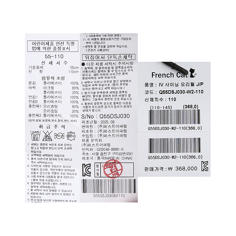 겉감 폴리에스터100배색 아크릴80 폴리에스터20안감1 폴리에스터100안감2 폴리에스터100충전재1 오리솜털80 오리깃털20충전재2 폴리에스터100 -