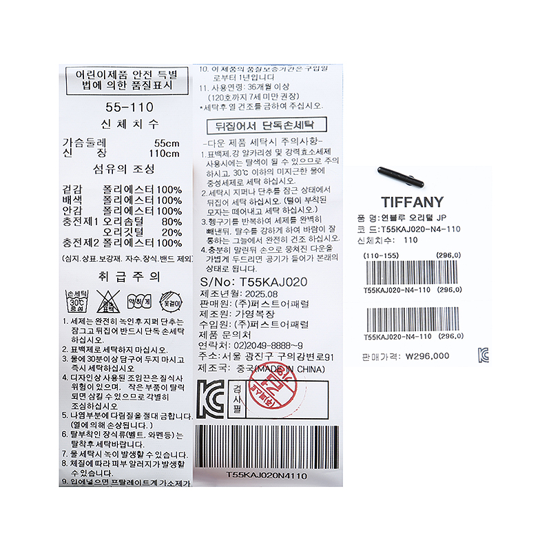 겉감 : 폴리에스터 100 배색 폴리에스터 100 안감 폴리에스터 100 충전제 1 오리솜털 80 오리깃털 20 충전제 2 폴리에스터 100 -