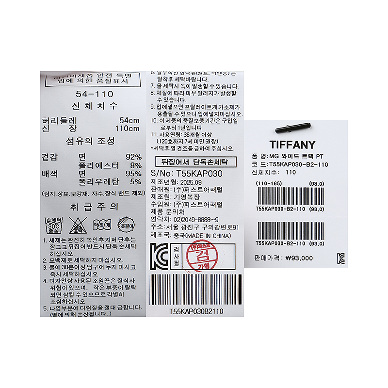 겉감 : 면 92 폴리에스터 8 배색 면 95 폴리우레탄 5 -