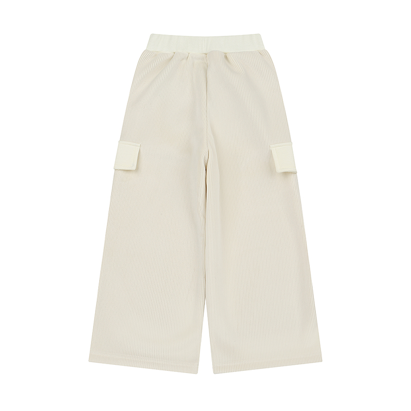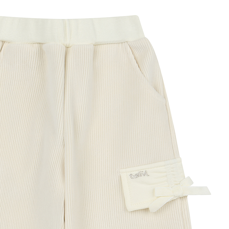 골지소재의 아이보리 트레이닝팬츠로 주머니에 귀여운리본으로 포인트를 준 아이템입니다.