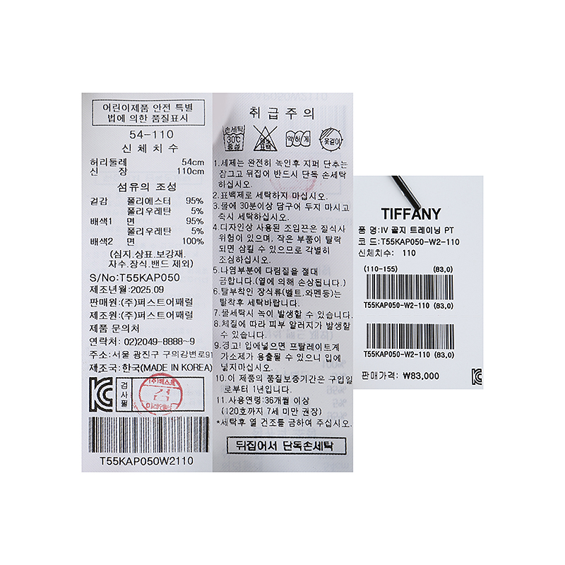 겉감 : 폴리에스터 95 폴리우레탄 5 배색 1 면 95 폴리우레탄 5 배색 2 면 100 -