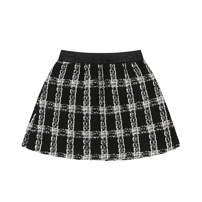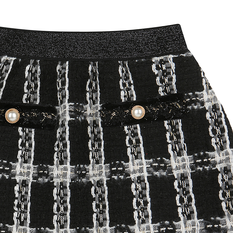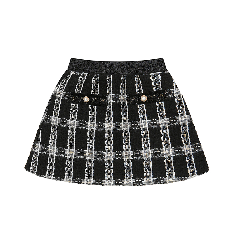 블랙 트위드 스커트로 고급스러운 트위드 TAPE 장식과 단추로 포인트를 준 스커트로 트위드자켓과 같이 코디하면 좋은 아이템입니다.