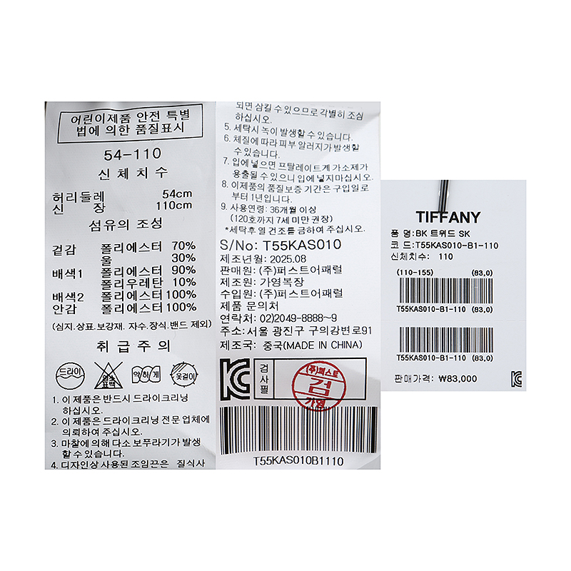 겉감 : 폴리에스터 70 울 30 배색 1 폴리에스터 90 폴리우레탄 10 배색 2 폴리에스터 100 안감 폴리에스터 100 -