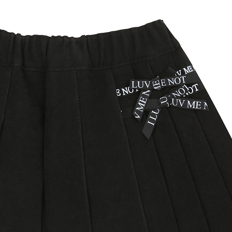 블랙주름스커트로 주름에 테이프배색포인트에 포인트를주면서 리본장식이 같이 고정되어있는 귀여운느낌의 스커트 아이템 입니다.
