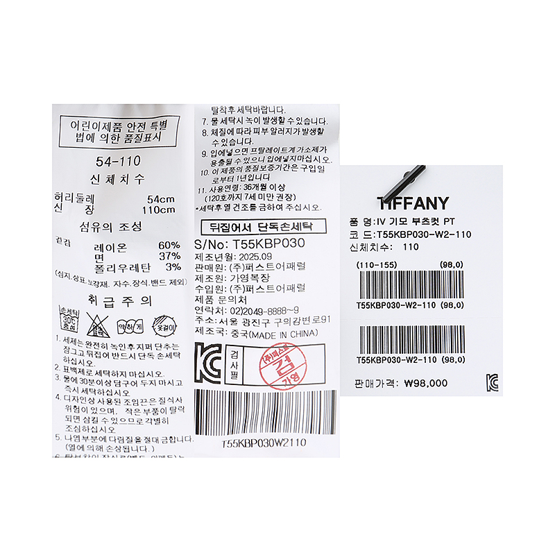 겉감 : 레이온 60 면 37 폴리우레탄 3 -