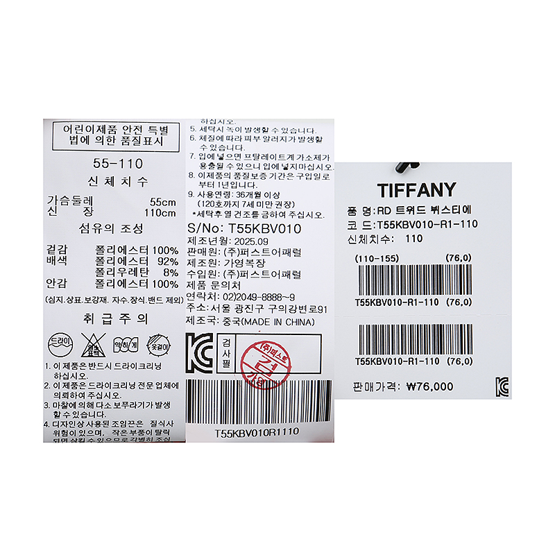 겉감 : 폴리에스터 100 배색 폴리에스터 92 폴리우레탄 8 안감 폴리에스터 100 -