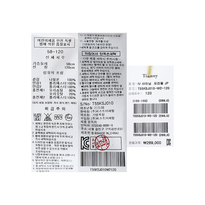 겉감 : 나일론 100 안감 1 폴리에스터 100 안감 2 폴리에스터 100 충전제 1 오리솜털 80 오리깃털 20 충전제 2 폴리에스터 100 -